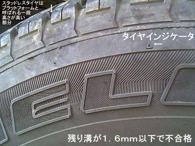 もし、1.6mmのぎりぎり点検OKであってもその車をしばらく乗り続ける(言い替えると車検直後手放さない)つもりならば、どうせすぐに交換しなければならないときがくるので、保険と思って換えてしまった方が、安全+車検時の検査員からのクレームで不合格とならないかビクビクするよりずっと気持ちがいい。支払うお金も変わらないしね。[top↑] ・ タイヤは新品時の表面が削れていない時のブレーキ制動距離は本来のゴム表面ゴム質が出てきたときと比較すると延びる傾向があるので、交換直後は特に慎重に運転しよう。タイヤならしは100km程度が目安。タイヤとホイール・リムとのなじみもある。[top↑] ・ タイヤの空気圧点検はガソリンスタンドでもできるが、足踏み式圧力ゲージs付きポンプも1000〜2000円(私は特売に並んで850円で購入)で購入できるので、自分用の物を持つことをお勧めします。なぜなら、現在の殆どのタイヤはクギがささった位では問題無く走れてしまうから。もちろん空気が入っていなければ論外だが、空気が抜けてしまってパンクしても、その場で空気を入れることができればガソリンスタンドまで走れることができタイヤ交換の手間(荷室の荷物を車から降ろし、テンパータイヤを出し、パンクしたタイヤと交換する)がかからない。私は2度この方法で助かっています。パンク修理後の荷物の積み直しも不要だから、復旧も楽。特に車が4WD車の人は、このありがたみを実感できることでしょう。[top↑] ・ タイヤの寿命の一つに、経年劣化寿命がある。これはタイヤのゴムが新品時から使用年数がたつほど硬化がすすむ。路面とのころがり抵抗も低下して、ブレーキ性能が出せなくなる。3年を目安に残り溝があっても、安全のためには交換をお勧めする。[top↑] |
