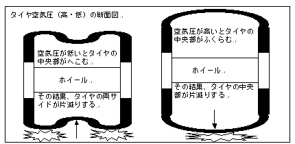 A級ポイント[top↑] ・ タイヤの空気圧が高過ぎると中央部が膨らんで減り、少な過ぎるとショルダー付近の左右が変磨耗する。 |