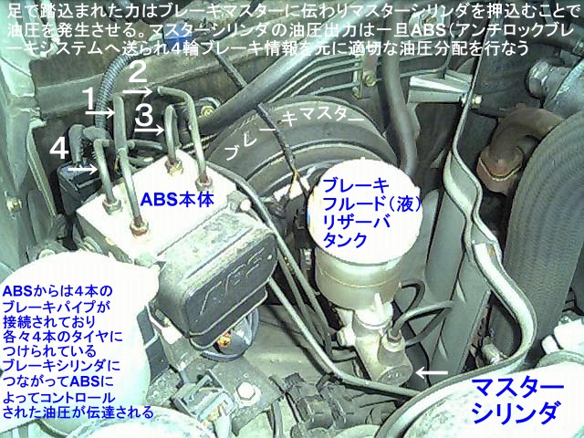 | 液漏れは非常に危険です。見つけたら即ディーラーでの修理を依頼しましょう。基本的にブレーキ性能があるか判らないので、車を自分で持込むのは道中非常に危険です。 A級ポイント[top↑] ディスク・キャリパ等を目視するとき、ブレーキ・クリーナーを使って汚れを落とすときれいになって点検しやすい様に思えるが、こと、液漏れ点検に関しては少量の液漏れによって生じたオイルに付着していたほこりごと拭き取ってしまい、あたかも、液漏れが無い様に見えたりするので注意。ブレーキ液は一種の油であることから、汚れやほこりが付着しやすい性質を持つ。よく、家庭用のモップに少量の油を含ませるのは、この付着性質を利用したものである。車に関していうと、少量ずつの液漏れによって、ブレーキ液の油に付着したほこりは黒くなり、且つ湿っていることが多い。これは、油は水よりしつこく残る為昼間の乾燥した空気の状態であっても湿っているのである。これに、注意を払うことで、早期発見ができる。水による付着か区別ができない場合、新聞紙にその黒く湿った汚れを拭いてやると、油なら油特有のにじみ方をするので判断できる。油特有のにじみって?という人は、エンジン・オイルゲージを引き抜き、同様に新聞紙で拭き取ってやればどういうものか判る。この油にじみ、是非とも覚えてほしい。油にじみあるところ、油漏れ可能性大なのですから。[top↑] |