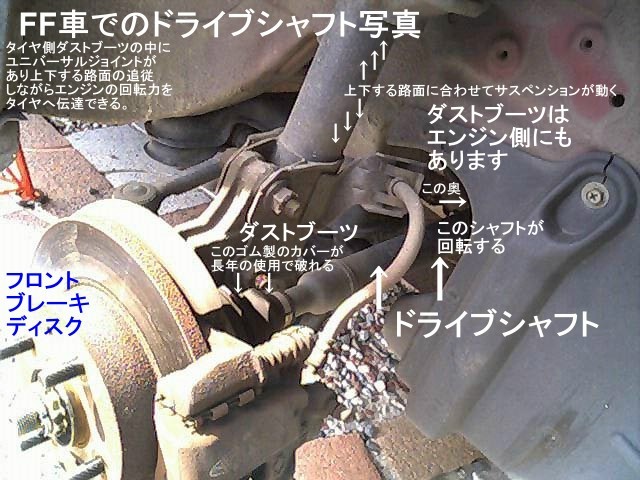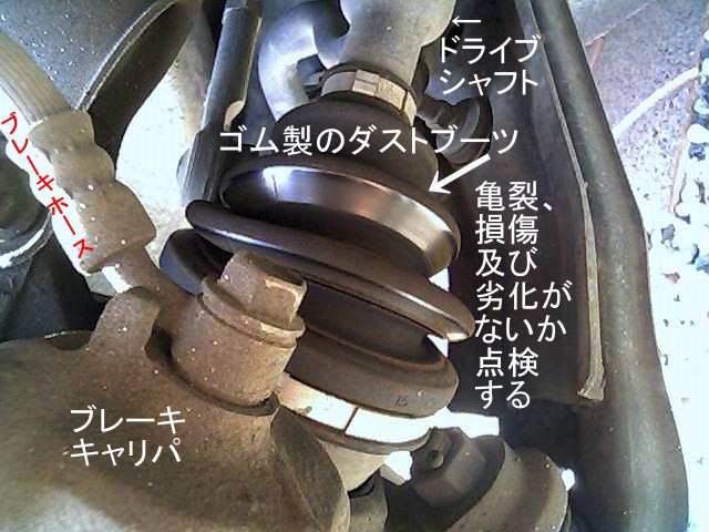 FF車で説明すると、エンジンに近い方をイン(内)側、タイヤに近い方がアウト(外)側と呼び、左右4ケ所のゴム製のダストブーツが取付けられている。この、ゴムが劣化することによって亀裂が生じる。また、ゴム自体の劣化がなくても、外的な力(下周りに衝撃があった等)が加わることで損傷する。FR車は、リヤ・デファレンシャル機構に近い方をイン側、タイヤに近い方をアウト側と呼ぶ。これらに、亀裂、損傷及び劣化がないか点検する。[top↑] |