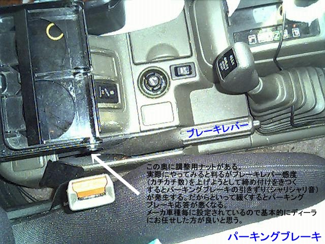 | A級ポイント[top↑][next>>] ・ ワイヤーケーブルは運転席から、後輪まで延びている全体を点検すること。特に終端手前は露出している箇所があればそこは水や外気にさらされておりサビ等が発生していないか点検し、必要に応じてロッド、機構部、ワイヤー等にグリス・アップ(添付含む)しておくと、ひっかかり等の不具合を未然に防ぐことができる。冬季にサイドブレーキを引いたままで駐車し、翌朝凍結する箇所がまさしくこういった箇所付近である。見たことは無いが、ドラムブレーキ内部での凍結もブレーキシューとブレーキドラム間に水が入り込んで凍結するとブレーキワイヤが正常であってもシューは定位置には戻らないだろう。[top↑][next>>] |