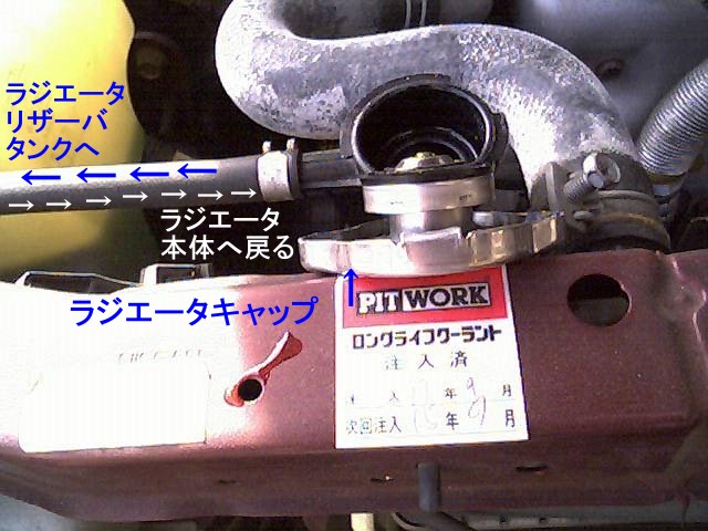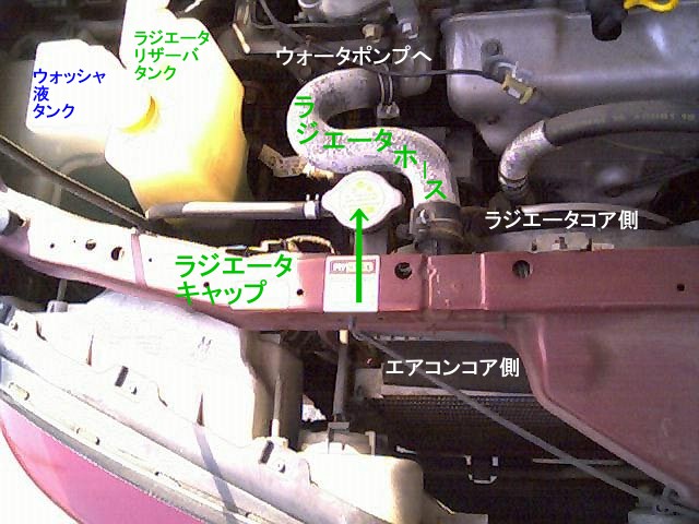 具体的にはラジエータ・ウォータポンプ・ラジエータホース「入口付近」「出口付近」・ラジエータキャップ等からの漏れがないか目視で点検する。エンジンをかけただけでもウオータポンプによって圧力がかかり、漏れがあれば確認できるが、冷却水温度が上昇した状態の方がより、厳しくチェックできる。 |