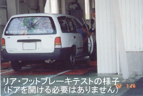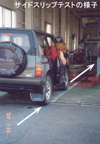 [top↑][next↓] 車検ラインに入ると、路面に、黄色と白色の線が書かれている。このうちの、内側にある線上にタイヤを乗せ、ゆっくりとそして真っ直ぐに車を進ませて、一定区間内(数メートル)における横ずれ(スリップ)の量が規定値内に納まっているか検査する。 通過速度は、遅すぎても、速すぎてもだめな様である。人がゆっくり歩くより、もう少しゆっくり進める位の速度。不慣れなころは、緊張して通過速度が速過ぎて不合格となったことはあるが遅すぎて不合格になったことはいまのところない。 運転席の窓を全開に開けて、ドアを自分の脇で挟み込んで頭を窓から出して、車の前フェンダーを通してその、ずーーーと先を見て車を進ませると、意外と楽に真っ直ぐ進ませることができる。 自動二輪車の免許を持っている人は、「ピーン」とくるでしょう。そう、あの「1本橋検定」の要領です。手前を見過ぎるとふらつきが出る。できるだけ、フェンダーの前方を見てチャレンジして下さい。 あと、車検ラインへ入る手前から、できるだけ車を真っ直ぐにしておくと更に楽です。 普段乗っていて、真っ直ぐ走らない兆候がある車は、事前にディーラー等で、「真っ直ぐ走らない」と告げて、整備して貰ってください。 サイドスリップテストの写真(民間テスター場)車検場も内容は同一ですからご心配なく。 写真は民間テスター場でのサイドスリップテストの様子です。 |