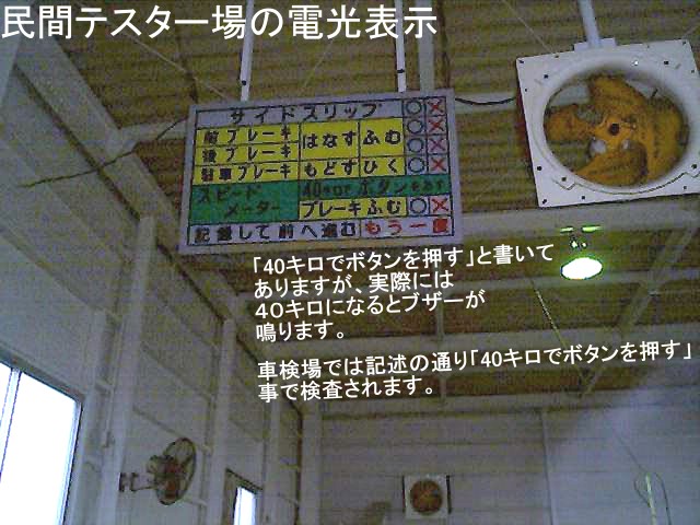 [top↑][next↓] 次に車を進めると、くぼみ(凹)みのある装置が、ブレーキテストを行う検査装置です。 くぼんでいる箇所にゆっくりとタイヤを落としていくと、検査機械が自動的に検知してフロントタイヤをくぼみ間隔を広げて、もう一段下げ、下部からローラーがせり上がってきてタイヤに押し付け回転を始めます。このとき、フット(足)ブレーキを必ず離して下さい。ローラーが回らないので検査ができません。回転が一定になると、上部電光掲示板に「ブレーキをふむ」が点灯します。 即時に、「ガツン」とブレーキを踏んでください。 検査の合否は、「ブレーキをふむ」が点灯から、ブレーキが作用するまでに所要した時間で判定します。ですから、いくらきっちり調整されていても、「ぼーー」としていて踏むのが遅れれば、「×」が点灯し、不合格となります、逆に調整が適切といえない状態であっても、応答が速ければ合格となります。「×」の場合でも、一旦「ブレーキをはなす」が点灯後、再び「ブレーキをふむ」が点灯され再検査してくれます。 写真は民間テスター場の電光表示他です。 |