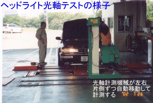 [top↑][next↓] スピードメータテストが終了後、次に向かう検査場所はヘッドライト光軸テストと9項の排気ガステストを同時に行う所である。 同時にというと誤解があるが、光軸をテストしながら排気ガスも測定すると表現するのが適切なのかも知れない。 車を進めると、停止ラインがあり、それが、光軸検査機械が要求する、距離である。検査機械に対し近すぎても遠すぎてもだめである。機械に取付けられている回転式ライトで赤又は青で停止位置が的確か自動的に診断される。こつは、ゆっくり車を動かすこと。速いと青いライトが点灯してからブレーキを踏んでも、許容範囲を超えて赤いライトが回転してしまう。サイドスリプテストの時の様に人が歩くよりゆっくりした速度で進め、青いライトが点灯したら、即時停止しよう。 もし、進ませすぎたために赤いライトが点灯しても、車をバックさせて青いランプが点灯するところへ戻してやれば良い。 車を停止させたら、ヘッドライトをハイビーム(遠目)側で点灯させる。 駐車ブレーキをしっかりとかける。 検査機械は。青いライトを点灯させた後、車を検査機械に対し垂直になる様床を動かして自動位置補正を行う。排気ガステストプローブを差し込む為に車から降りるが、慌てて降りるとこの床の動きでビックリする。 前にも触れているが、4灯式で且つ同時点灯の車は、ロービーム(近目)側はダンボールの切れ端等でカバーしておくこと。 光軸テストは左右共、検査される。検査方法は、検査機械の一部に集光器が有り、光軸だけではなく光量も規定に満たなければ不合格となる。 光軸のずれに関しては、事故等による車体変形による極端なずれが無い限り、民間テスター場での再調整によって合格することができます。 |