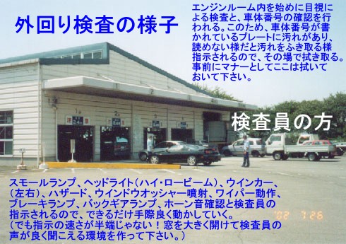 1/11[top↑][next↓] 外回り検査 まず、外観(視覚)的に確認できる検査は、ほとんどこの最初の項目で行われる。この項目と10項の下回り検査以外は、全て機械が行う。 検査員が近づいてきたら、まず、エンジンを停止し、ボンネットを開けて待つ。 自分の番になると、検査票を要求されるので、書類一式をバインダー等でまとめて、且つ、下敷き兼用にしておくと検査員の方が楽に記入できる。 |