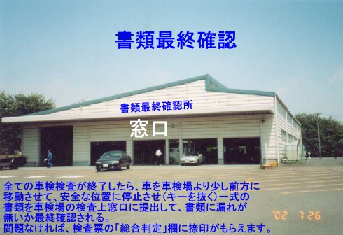 [top↑][next>>] 全ての車検検査が終了したら、車を車検場より少し前方に移動させて、安全な位置に停止させ(キーを抜く)一式の書類を車検場の検査上窓口に提出して、書類に漏れが無いか最終確認される。 問題なければ、検査票の「総合判定」欄に捺印がもらえます。 晴れて合格出来ましたら、書類の中から規定の種類のみ提出します。詳しくは車検合格ページへ。 不合格項目があれば、修理して再度車検場の検査ラインに並び、不合格項目のみの再検査を受けます。[top↑][next>>] |