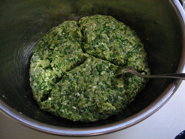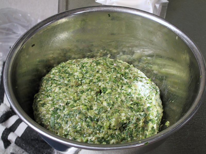 左はつぶしたニンニクと白菜のみじん切りを加えた具材全てです。 これに塩(ミネラル塩)を一つまみ入れて、使い捨てビニル手袋を片手にはめて混ぜあわせると「餃子あん」(右写真)の出来上がり〜〜! |