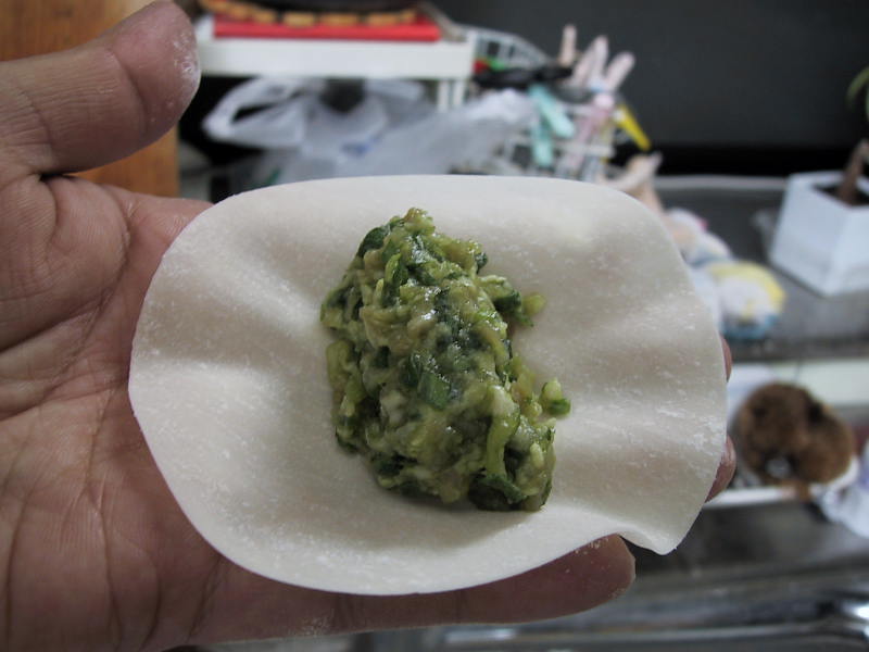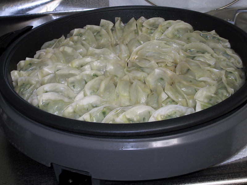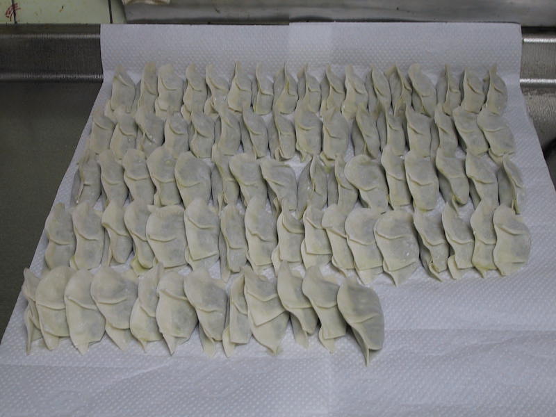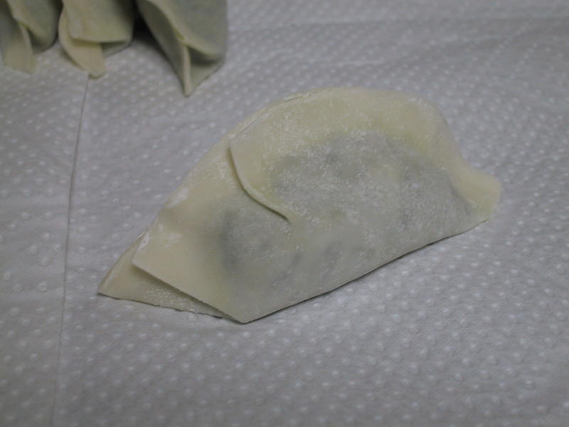 皮にあんを載せて包み、餃子にします。 ここでの、こつ。 半月の形となる端と端をきっちり、水を付け締めること。肉汁が漏れて旨みが減少してしまいますからね。半月の上部分は焼く時の蒸気でくっつきます。飾りの折り返しは、私は2つ。時間がある人は希望の数折り返して。 |
