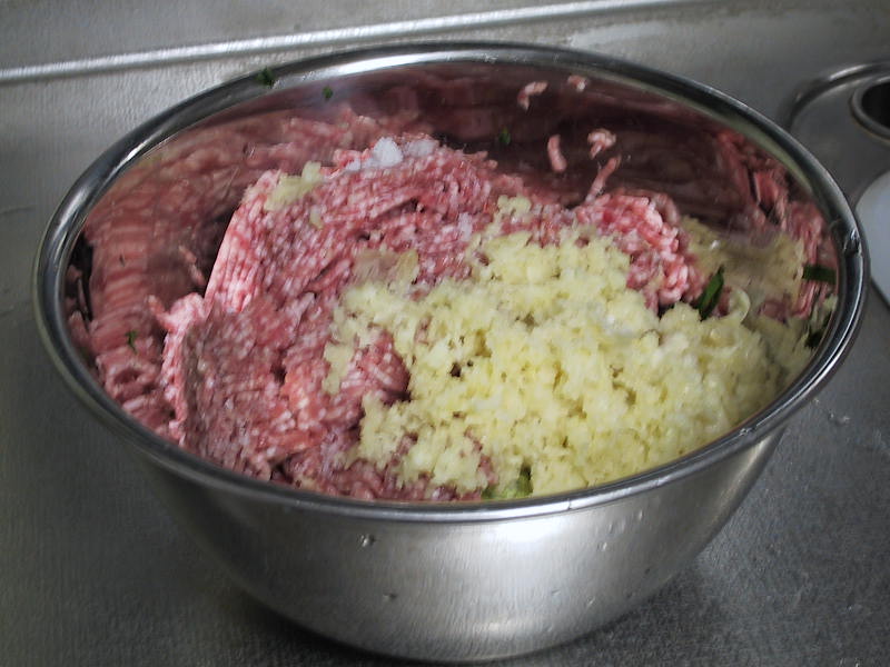 | ニラはみじん切りにすることで、香りがもの凄く出ます。 みじん切りは2〜3mm位の間隔かな。間隔大きいと皮に詰めた時皮を突き破ってしまうぞよ!丁寧にやって、出来る範囲で早く、誤って手を切らない様に注意して。 香りを逃がさないように、上から豚引き肉を乗せます。(乗せるだけ)。 |