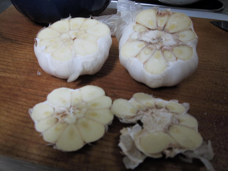 にんにくは、テレビの伊藤家の食卓からアイデア頂き。 裏の部分を左の写真の様に下の部分を5mmくらい切落とします。 水道の蛇口の下をさっとくぐらせる位の水を掛けて20秒電子レンジに掛けます。(暖め過ぎないこと。味と香りが落ちてしまいます)すると、あら不思議ころころポロポロとにんにくが皮から出てきます。 あとは、ニンニク潰し機でひとかけらずつつぶしてボウルに投入します。 |