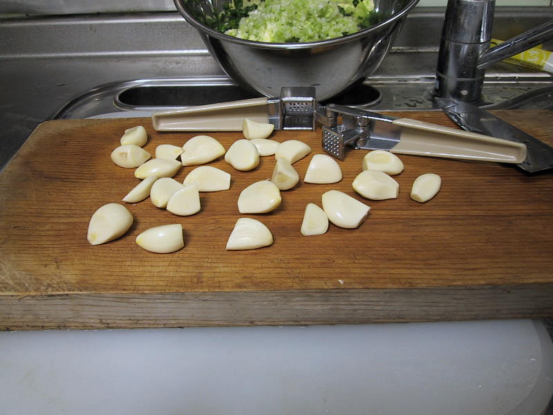 実例でその香り?の凄さを説明しましょう。管理人は土曜日の夜食べて、月曜日の電車に乗って座席に座っていました。次の駅で乗ってきた女性がたまたま横に。その後電車が走り出して数秒後席を立ってしまいました。 それでも、お店にはない「この味」を一度知ってしまうとやめられないのですヨ。私は月一ペースで食べてます。 材料:3人前(一人26個、他は食べないので「主食」兼用) ニラ:3ワ ニンニク:2個(2カケラではありません2個!)、 豚ひき肉:600g 白菜(夏はキャベツ):3〜4枚(餃子内への水出し様です) 餃子皮:大判26枚×3 塩:少々 |