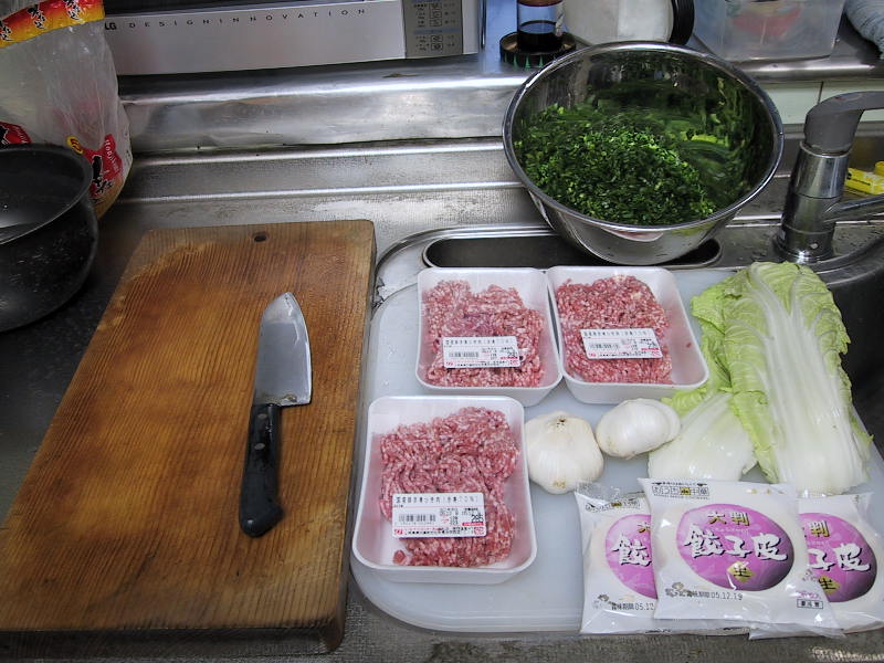 | 材料費は3人分で約1000円前後ですね。これで78個の餃子ができます。 *一人の場合、それぞれを1/3して下さい。 |